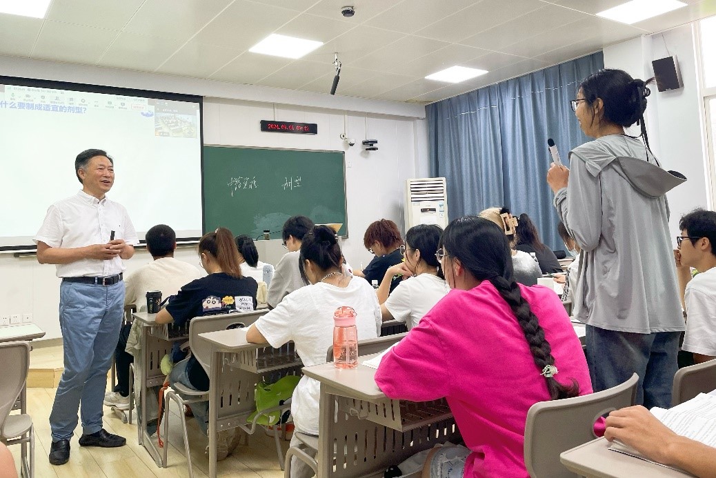 在《中药药剂学》课堂讲授过程中,狄留庆教授首先讲解了“101计划”的公司产品改革试点、中药学类专业教学目标,中药剂型从传统制剂到现代制剂的应用以及未来缓控释制剂、靶向制剂、自调式给药系统的发展。在分享雷允上药业六神丸与精华制药王氏保赤丸的制作技艺均已列入国家级非物质文化遗产名录等案例基础上,强调我们中医药人要坚定文化自信,坚守匠心精神,推动中医药发展。中药药剂学具有实践性、应用性、综合性强的特点,狄教授要求同学们结合理论和实验,充分研读文献、深入思考、勤于实践,学会研究性、探索性学习方法,培养自己发现问题、分析问题、解决问题的能力。在学习过程中要突出中医药思维,夯实中药制剂理论,注重中药制剂技术,强化多学科交叉应用,培养自己中药药剂学学术能力和应用能力。