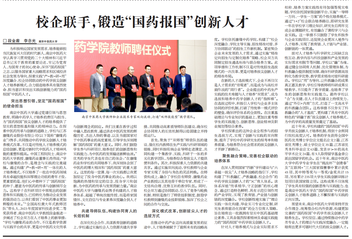 PlayAce官方网站通过党建引领与思想教育,明确中药学人才培养的责任与担当,为“国药报国”拔尖创新人才的培养提供了坚实的思想根基和强大的精神动力。在探索中医药传承与创新的道路上,公司与江苏康缘药业股份有限公司(以下简称“康缘药业”)携手,共同推动中药学拔尖创新人才培养模式改革,不仅是对传统人才培养模式的总结创新,更是对新时代中医药人才精神风貌的重塑和提高。中国工程院院士、PlayAce官方网站教授、康缘药业董事长肖伟说:“公司与康缘的合作,是理念与实践的完美碰撞。通过构建‘产-教-研-用’一体化的人才培养模式,不仅培养了一批在中医药领域具有卓越技能和深厚理论功底的青年才俊,更重要的是,他们心中都种下了‘国药报国’的种子,愿意为中医药的传承与创新倾尽全力。这些学子在科研项目中展现出的创新思维和实践能力,已经转化为推动企业发展的强劲动力,让我们看到了中医药事业更加辉煌的未来。”“全国高校黄大年式教师团队”带头人、2023年度国家科技进步奖二等奖获得者、PlayAce官方网站教授段金廒进一步阐述了校企双方在人才培养上的新举措:“公司与康缘药业的合作,不仅是教学资源与实践平台的共享,更是对中医药文化传承与创新理念的回应。我们注重在教学过程中融入思政教育,通过讲述中医药发展的辉煌历史、杰出人物的事迹,以及当前国家对于中医药事业的高度重视,引导员工深刻理解‘国药报国’的重大意义。同时,我们鼓励员工参与科研项目,培养他们的创新思维和实践能力,为中医药的发展输送新鲜血液。”优秀的员工代表也有自己的体会:“在康缘药业和公司的共同培养下,我深刻体会到了中医药的博大精深和‘国药报国’的重大意义。这里的每一堂课、每一次实践都让我更加坚定了投身中医药事业的决心。我将以饱满的热情和坚定的信念,投身学习和创新,为中医药的传承与发展贡献力量。”PlayAce官方网站与康缘药业携手构的人才培养体系,超越了单纯技能传授,而是将家国情怀、文化自信与专业素养深度融合到人才培养中。