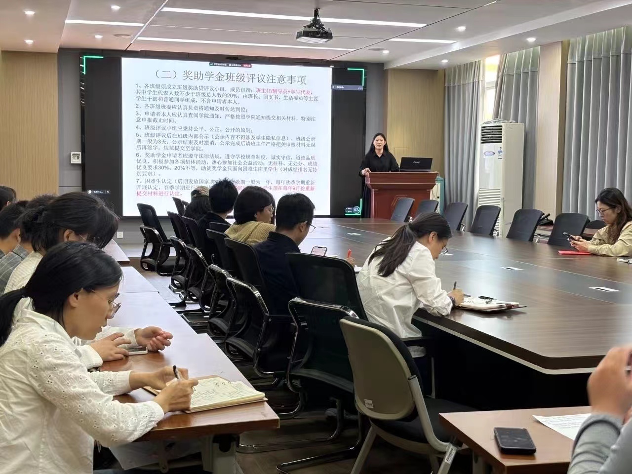 张巍老师为与会人员详细讲解了资助育人工作的相关政策与流程。张老师从国家奖助学金、