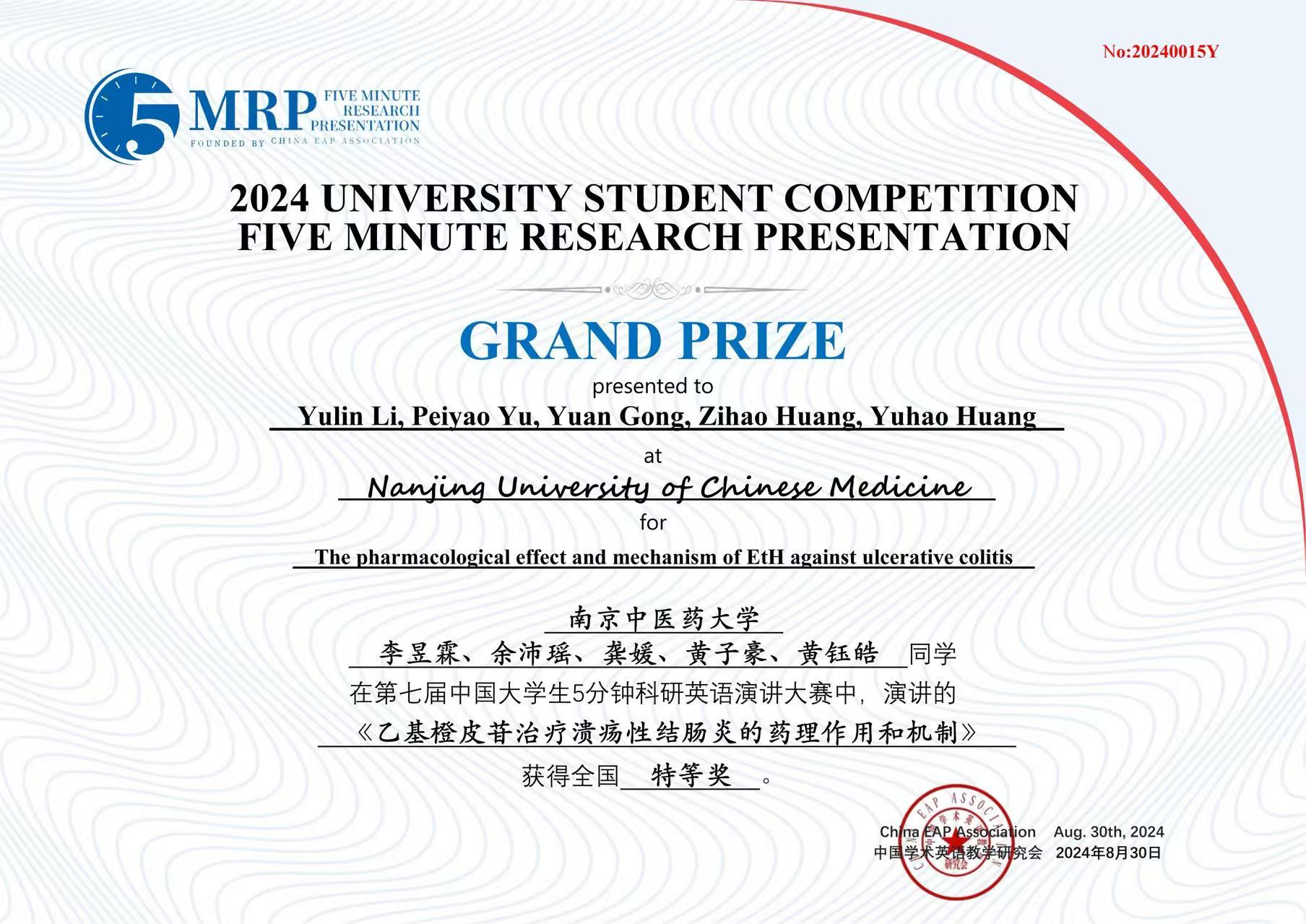 第七届中国老员工五分钟科研演讲(英语)大赛近日圆满落幕,公司药学院2023级中药学九年制(新中PlayAce游戏平台班)李昱霖同学所率团队在此次赛事中取得了优异的成绩,荣获医学组全国特等奖。