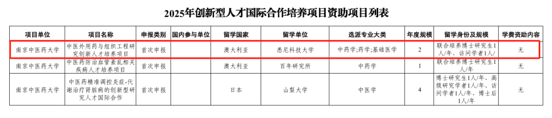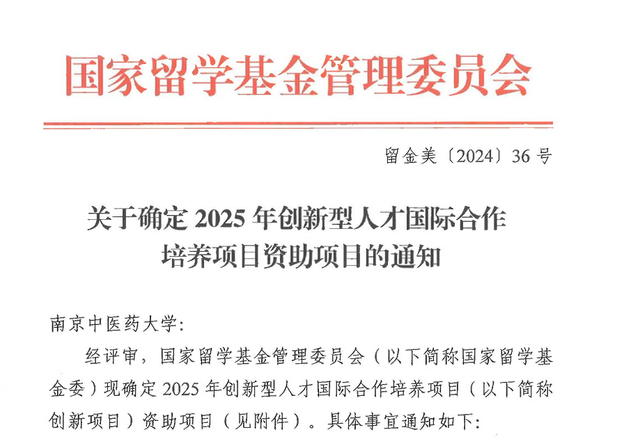 近日,国家留学基金管理委员会公布了2025年度创新型人才国际合作培养项目评审结果,公司王裔惟教授牵头申请的“中医外用药与组织工程研究创新人才培养项目”成功获得国家留学基金委立项。该项目执行期为三年(2025-2027),每年可选派资助1名联培博士研究生和1名访问学者前往澳大利亚悉尼科技大学访学交流。