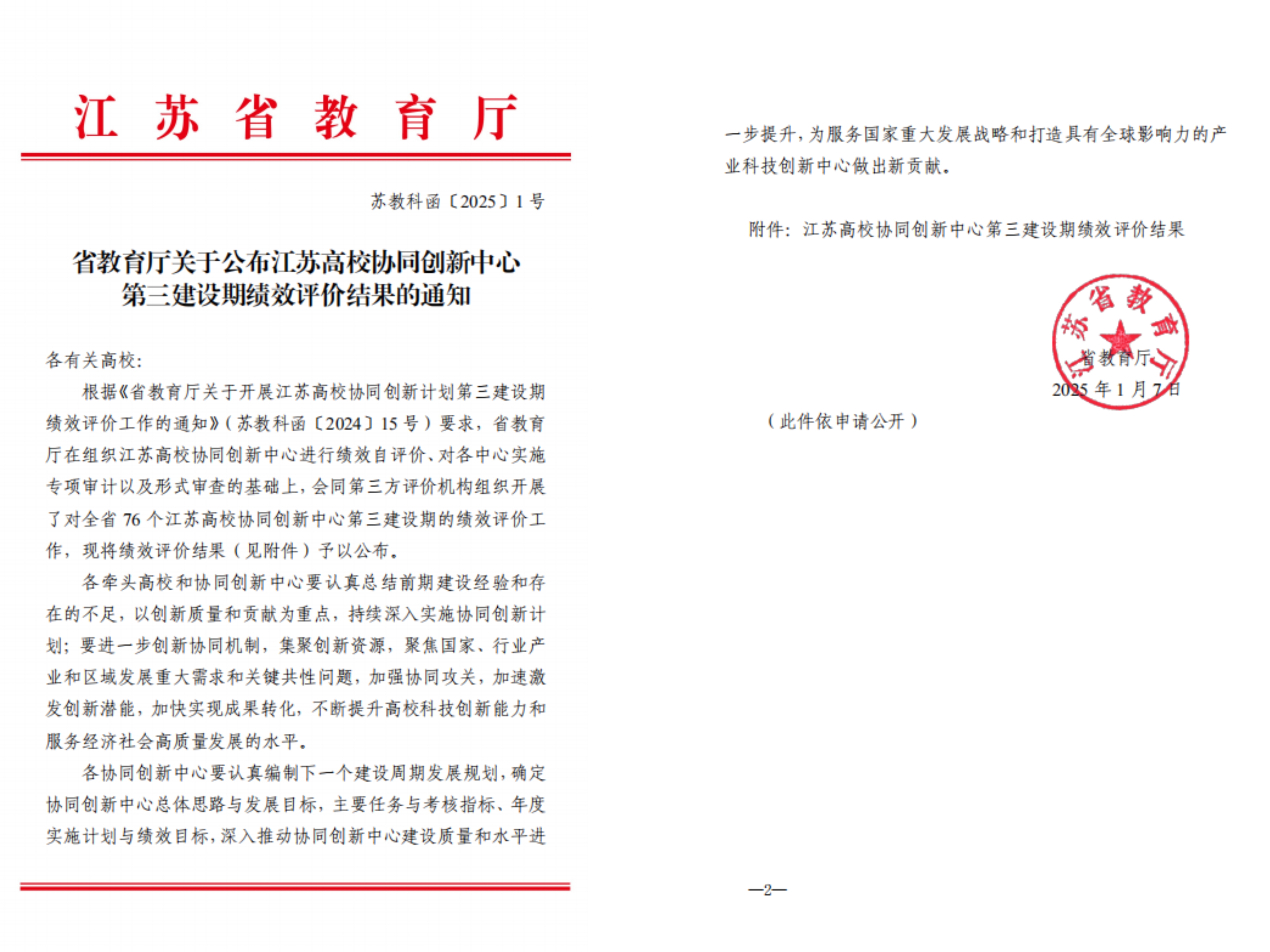 据悉,根据《省教育厅关于开展江苏高校协同创新计划第三建设期绩效评价工作的通知》(苏教科函〔2024〕15 号)要求,省教育厅在组织江苏高校协同创新中心进行绩效自评价、对各中心实施专项审计以及形式审查的基础上,会同第三方评价机构组织开展了对全省76个江苏高校协同创新中心第三建设期的绩效评价工作。