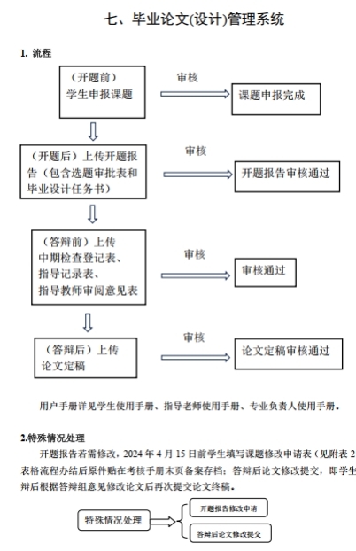 毕业论文(设计)管理系统流程如下图,详见实习管理手册P82页。