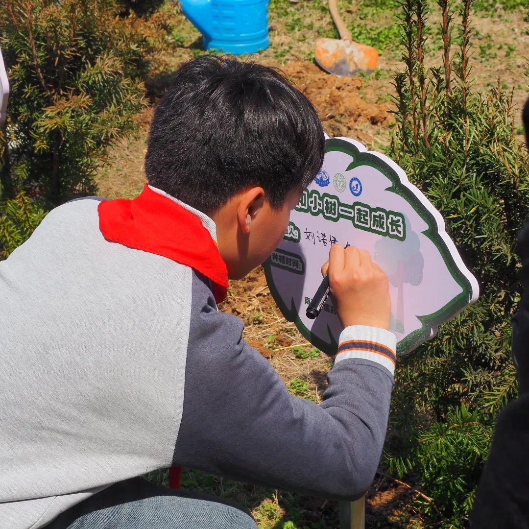 苜蓿园里,研究生党员杨贺带领孩子们手持特制药锄,翻土时讲解板蓝根大青叶的蜕变,移栽时传授金银花忍冬的生存智慧。在中药作画体验区,菊花、枸杞等药材变身天然画笔,孩子们用决明子拼出妙手回春的汉字图腾。在共植红杉环节,与会领导与孩子们共同为树苗挂上心愿牌,研究生志愿者唐雨晴写下:愿中医药文化如红杉般扎根成长。