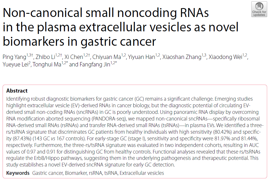 202543日,国际知名学术期刊Journal of Hematology & Oncology(中科院医学一区,IF=29.9)在线发表了公司麻彤辉教授、金芳芳副教授团队的最新研究成果:Non-canonical small noncoding RNAs in the plasma extracellular vesicles as novel biomarkers in gastric cancer