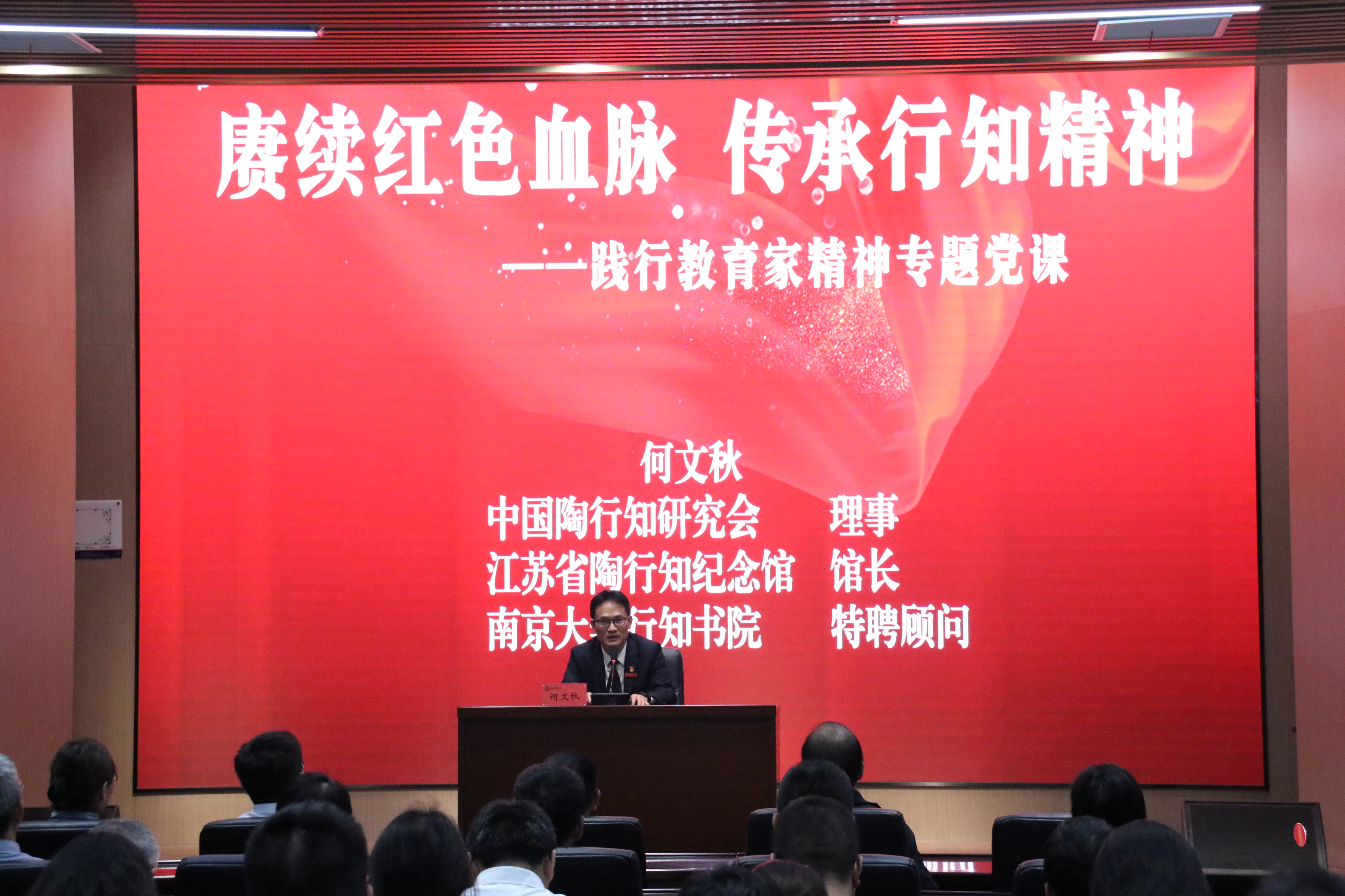 中国陶行知研究会理事、陶行知纪念馆馆长何文秋首先为大家讲授题为《赓续红色血脉、传承行知精神》的专题党课。他从“四有”好老师引入,深情深入地解读了陶行知先生的生平事迹、教育思想,声情并茂地讲述“晓庄精神”和“行知精神”,带领大家学习了红色晓庄的革命历史,感怀晓庄英烈们崇高的革命理想,使全体教师党员深刻领会到为党育人、为国育才的深刻内涵。党课内容丰富、生动,教师党员们深刻感受到陶行知先生深沉的家国情怀和无私的教育大爱,并在心中激起传承和践行教育家精神的强烈共鸣。