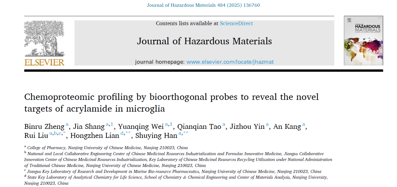 PlayAce游戏平台韩疏影副教授、刘睿教授团队联合南京大学练鸿振教授在知名学术期刊Journal of Hazardous Materials(中科院一区,IF: 12.2)在线发表题为“Chemoproteomic profiling by bioorthogonal probes to reveal the novel targets of acrylamide in microglia”的最新研究成果。