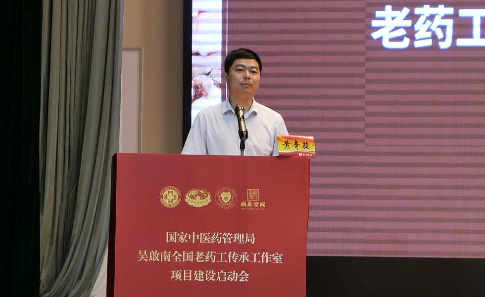 在学术报告环节,江苏省中医药管理局中医科教处一级主任科员黄奇骏对全国老药工传承工作室建设标准与要求进行了详细解读,为工作室的建设指明了方向。