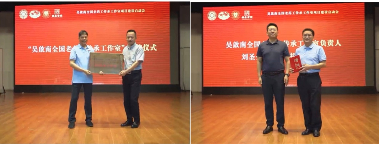 在热烈的掌声中,石志宇巡视员为“吴啟南全国老药工传承工作室”授牌。尹刚副处长为“吴啟南全国老药工传承工作室”负责人刘圣金教授颁发聘书。